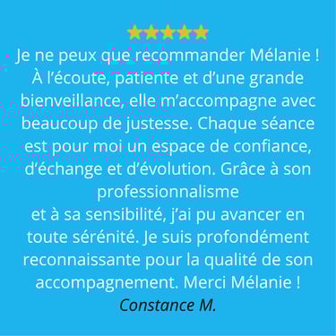 Des séances pour aller plus loin : prendre une décision, lever un blocage, sortir d'un schéma... Je t'offre une bulle d'écoute. Un moment d'échanges sans jugement, pour t'aider à aller de l'avant.